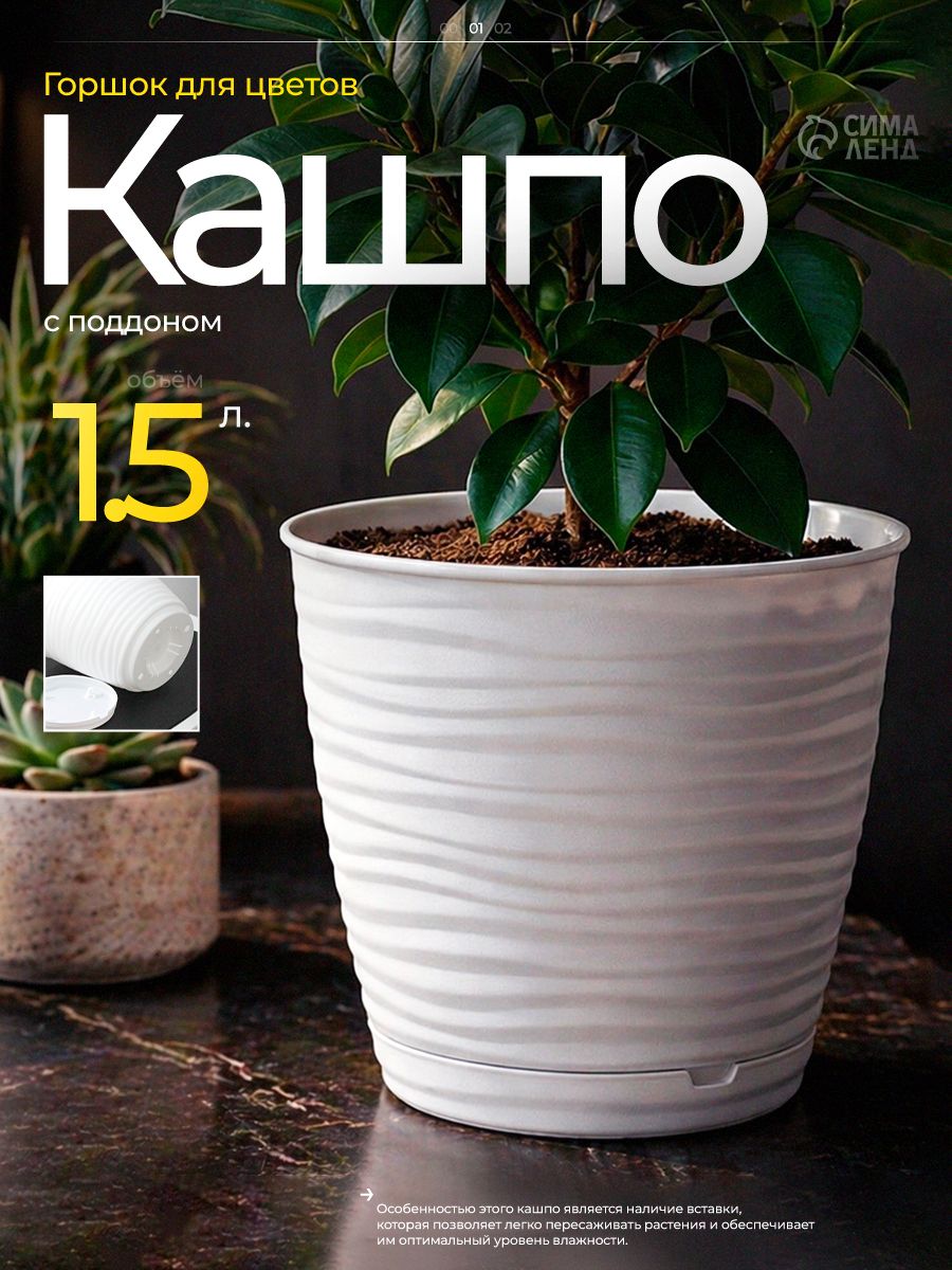Горшок для цветов, 1.5 л, кашпо для растений комнатных, пластиковый с поддоном, белый