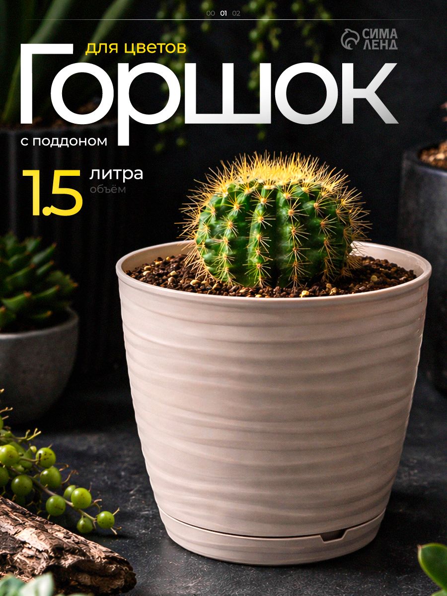 Горшок для цветов, 1.5 л, кашпо для растений комнатных, пластиковый с поддоном, бежевый