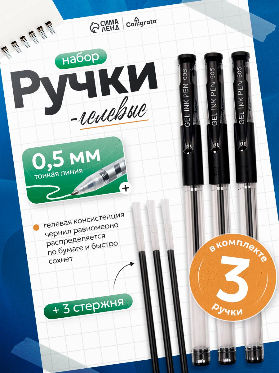 Набор гелевых ручек, 0.5 мм, 3 штуки + 3 чёрных стержня
