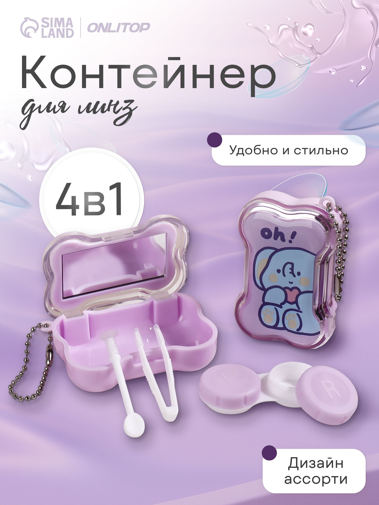 Набор для контактных линз 4 предмета контейнер, пинцет, палочка, футляр с зеркалом, цвет разноцветный