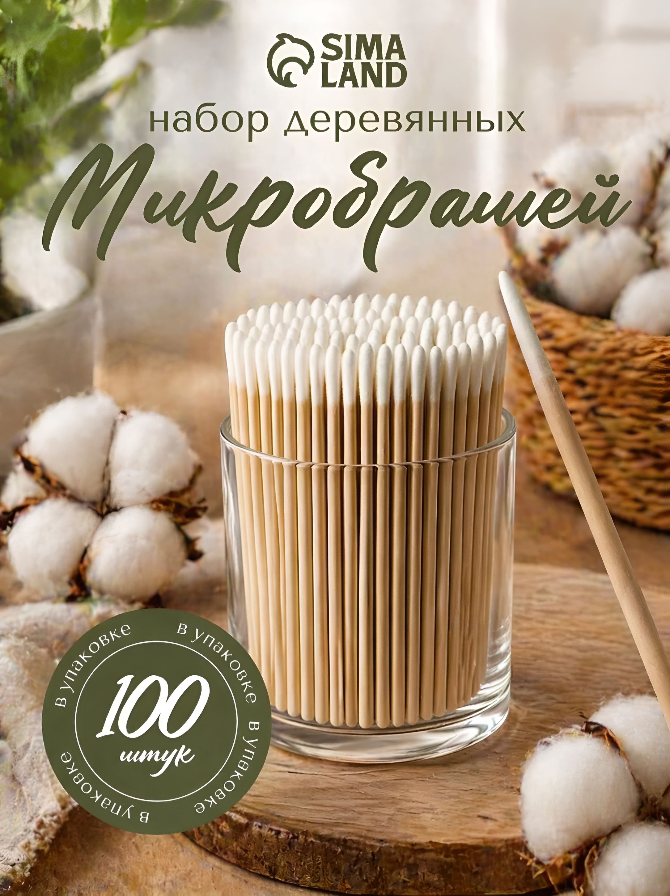 Микробраши для ресниц, бровей и ногтей на деревянной основе, заострённые, 10 см, 100 шт