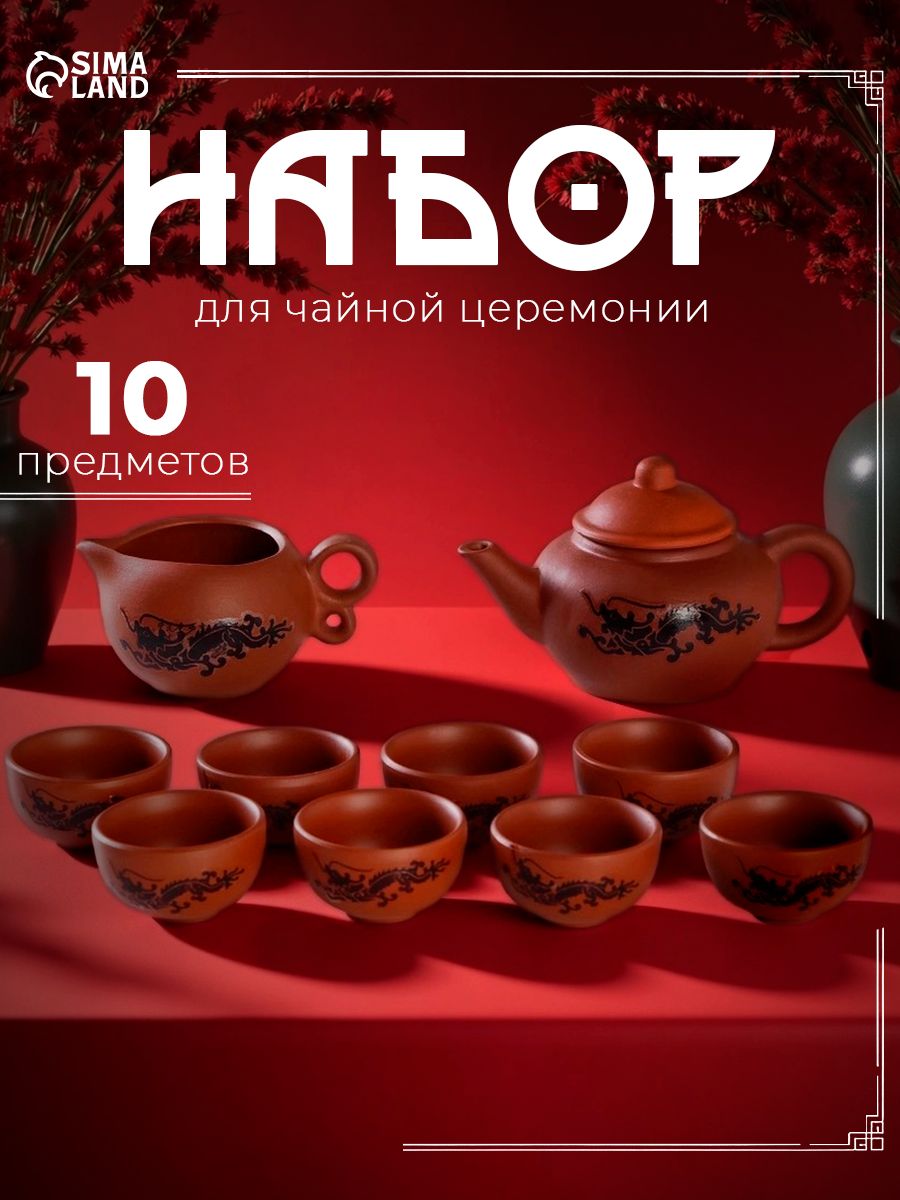 Набор для чайной церемонии керамический Дракон, 10 предметов: 8 пиал 35 мл, чайник 200 мл, чахай 150 мл, цвет коричневый