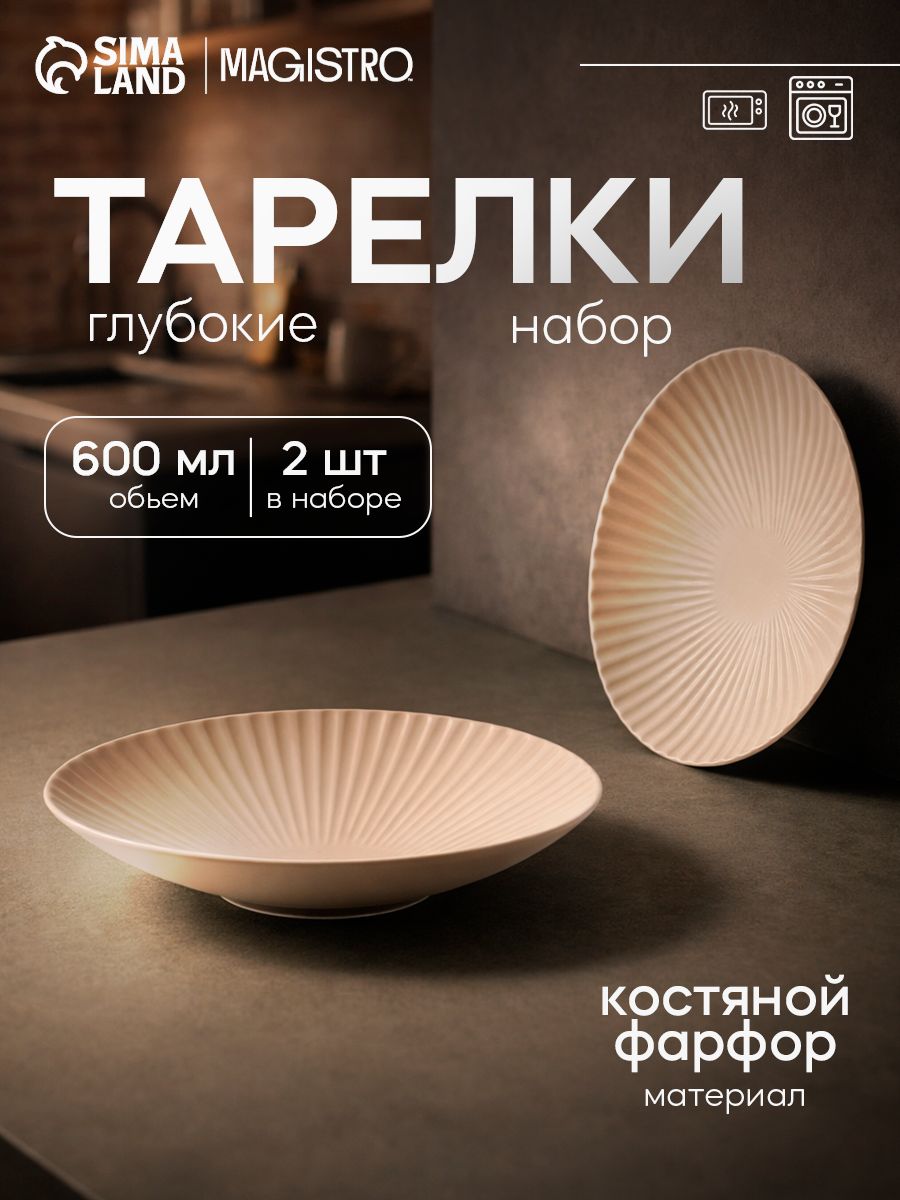 Тарелки глубокие 2 шт, объем 600 мл, набор салатников фарфоровых, диаметр 21,5 см, Magistro "Jarwah"