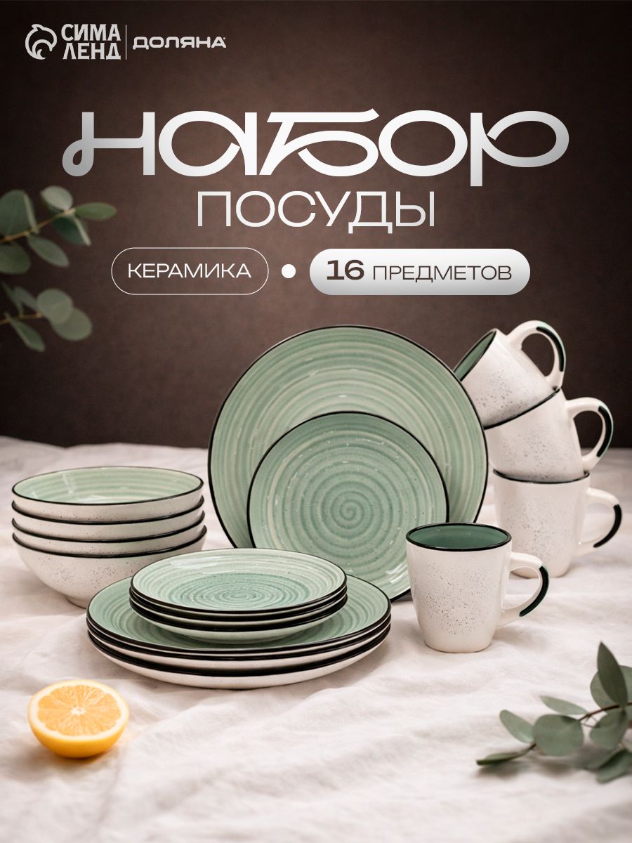 Набор столовой посуды, 16 предметов, на 4 персоны, Доляна Nature Тар, зелёный
