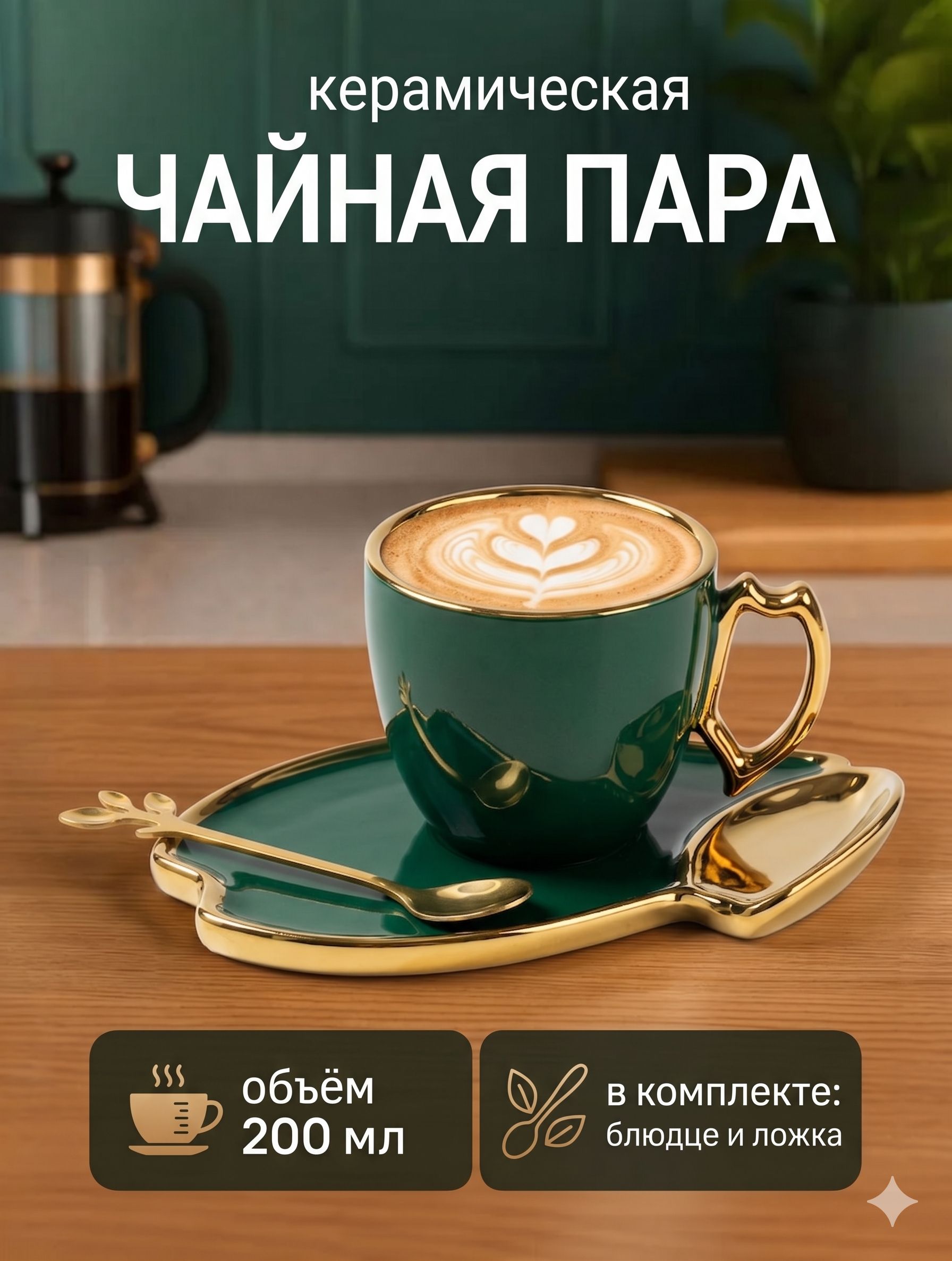 Чайная пара "Ливона", чашка 200 мл, блюдце 14 см, ложка, цвет изумрудный