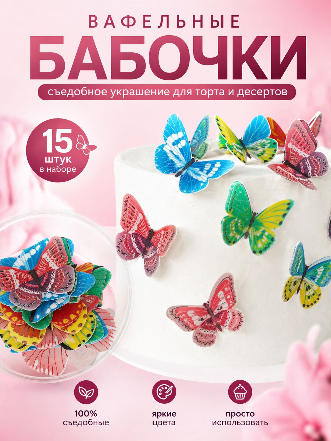 Украшения для торта съедобные, вафельные бабочки разных размеров, ассорти цветов, 15 штук