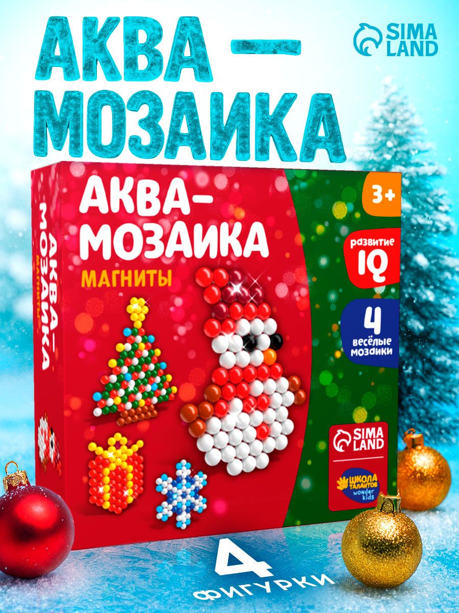 Аквамозаика для детей, 306 шариков, "Снеговик с ёлкой" / 4 карточки-основы, 4 магнита / новогодние подарки для детей