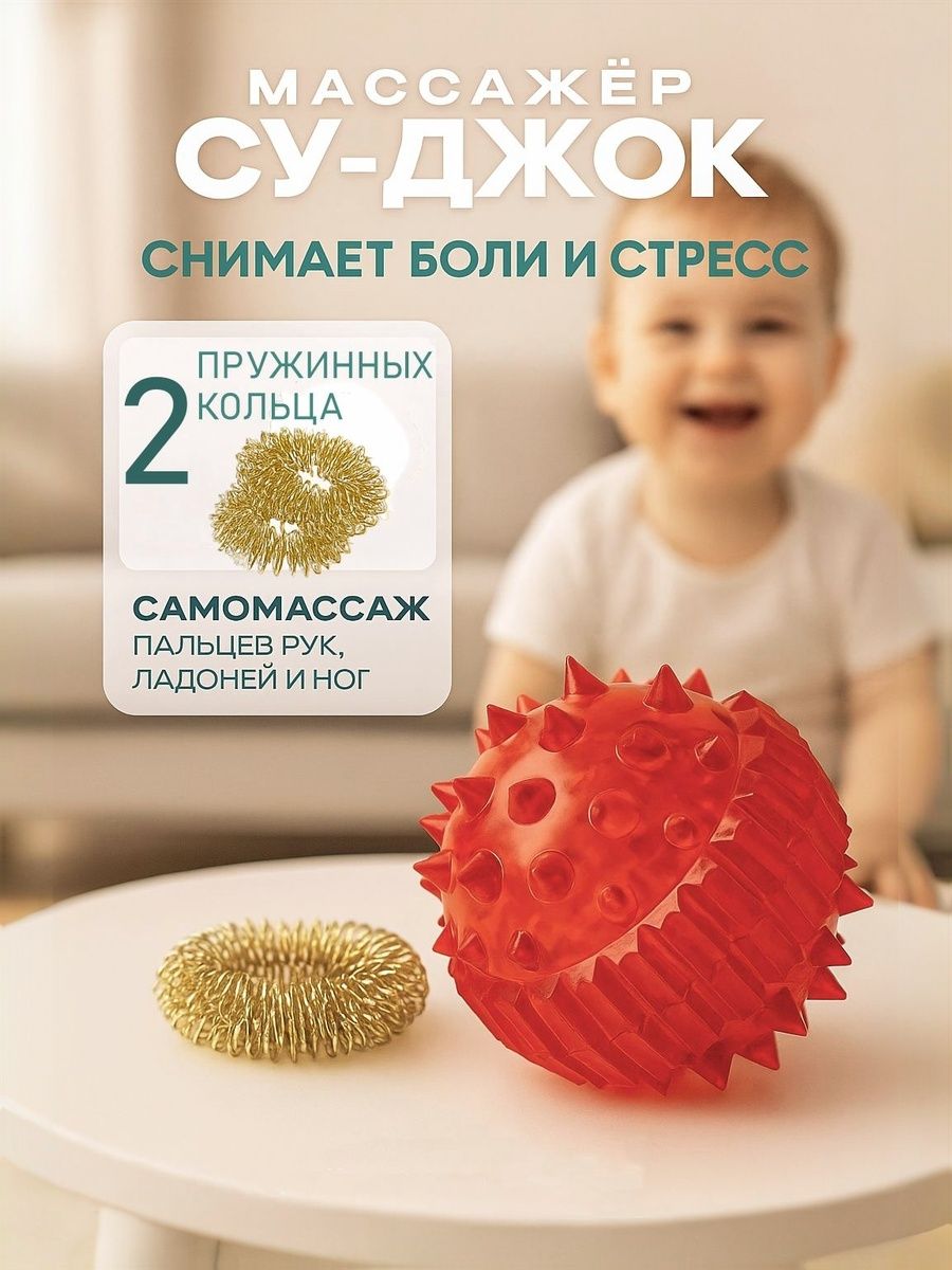 ONLITOP Су Джок, массажный шарик для рук с шипами, 1шт + 2 кольца для пальцева 2 шт., красный