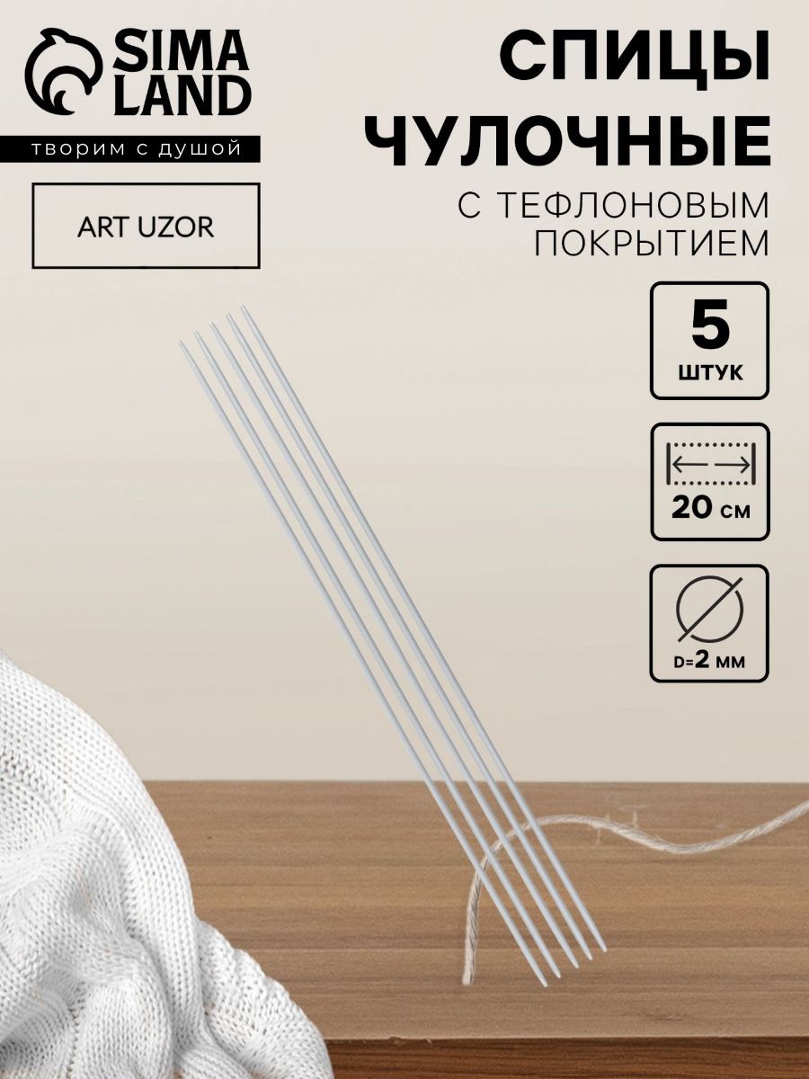 Спицы для вязания, чулочные, с тефлоновым покрытием, d 2 мм, 20 см, 5 шт.