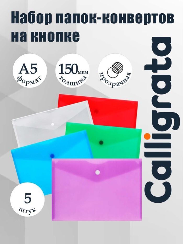Папка-конверт на кнопке для документов и бумаг, А5 набор 5 штук