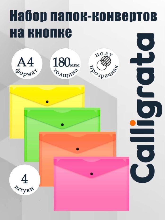 Папка-конверт на кнопке для документов и бумаг неон А4, набор 5 штук