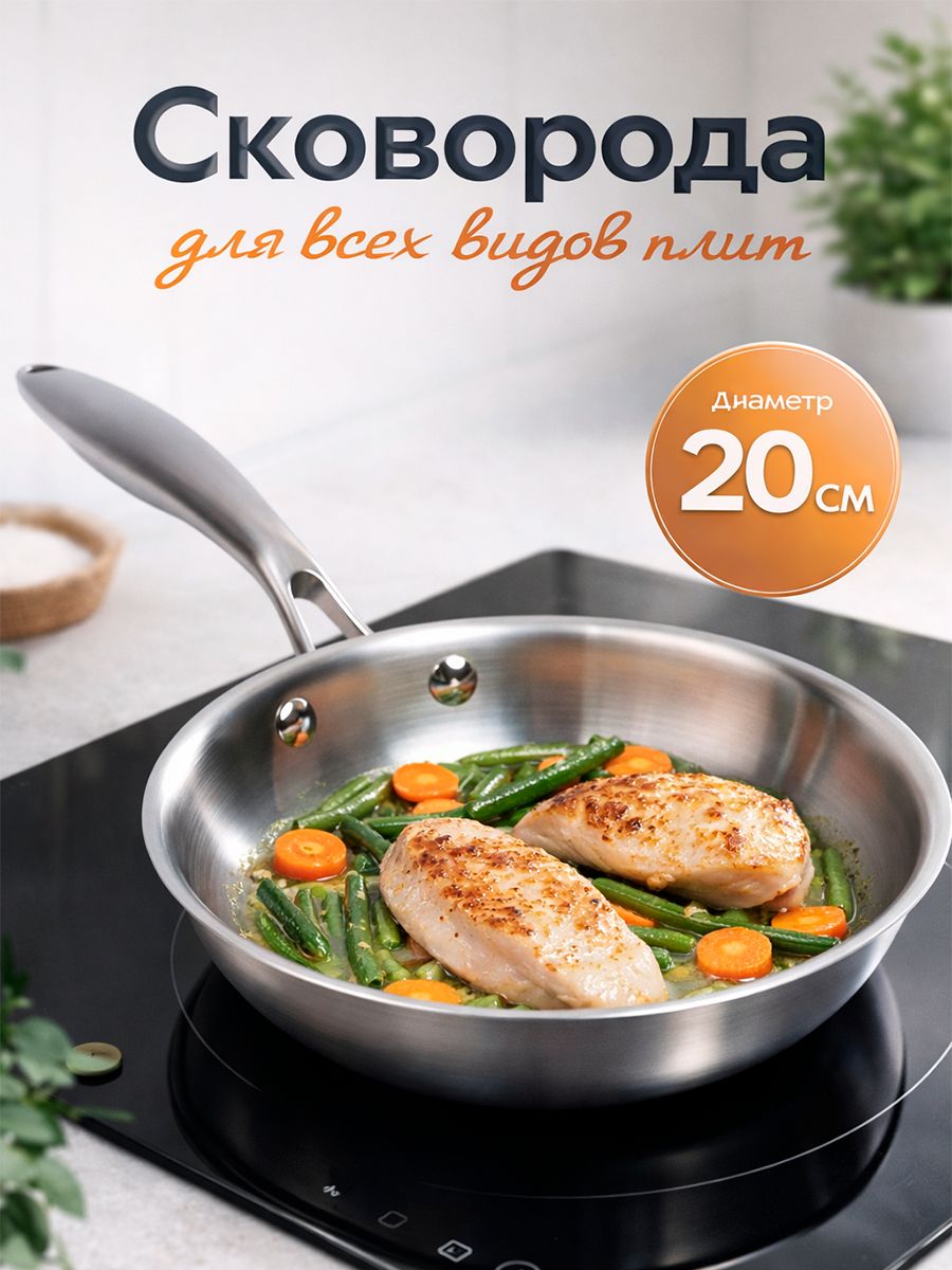 Сковорода, диаметр 20 см, высота 5 см, для любой плиты, нержавеющая сталь