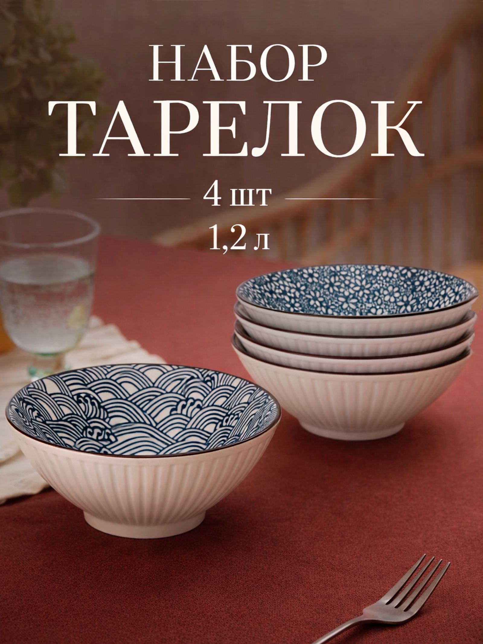 Тарелки суповые глубокие 1,2 л, набор 4 шт, фарфоровые 20 см, Доляна "Japan"