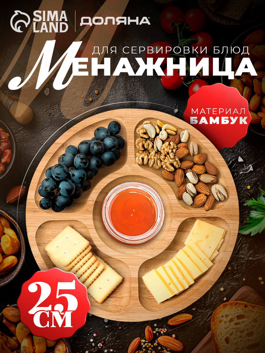 Менажница деревянная для подачи и сервировки, 5 секций, диаметр 25 см, бамбук, Доляна "Striata"
