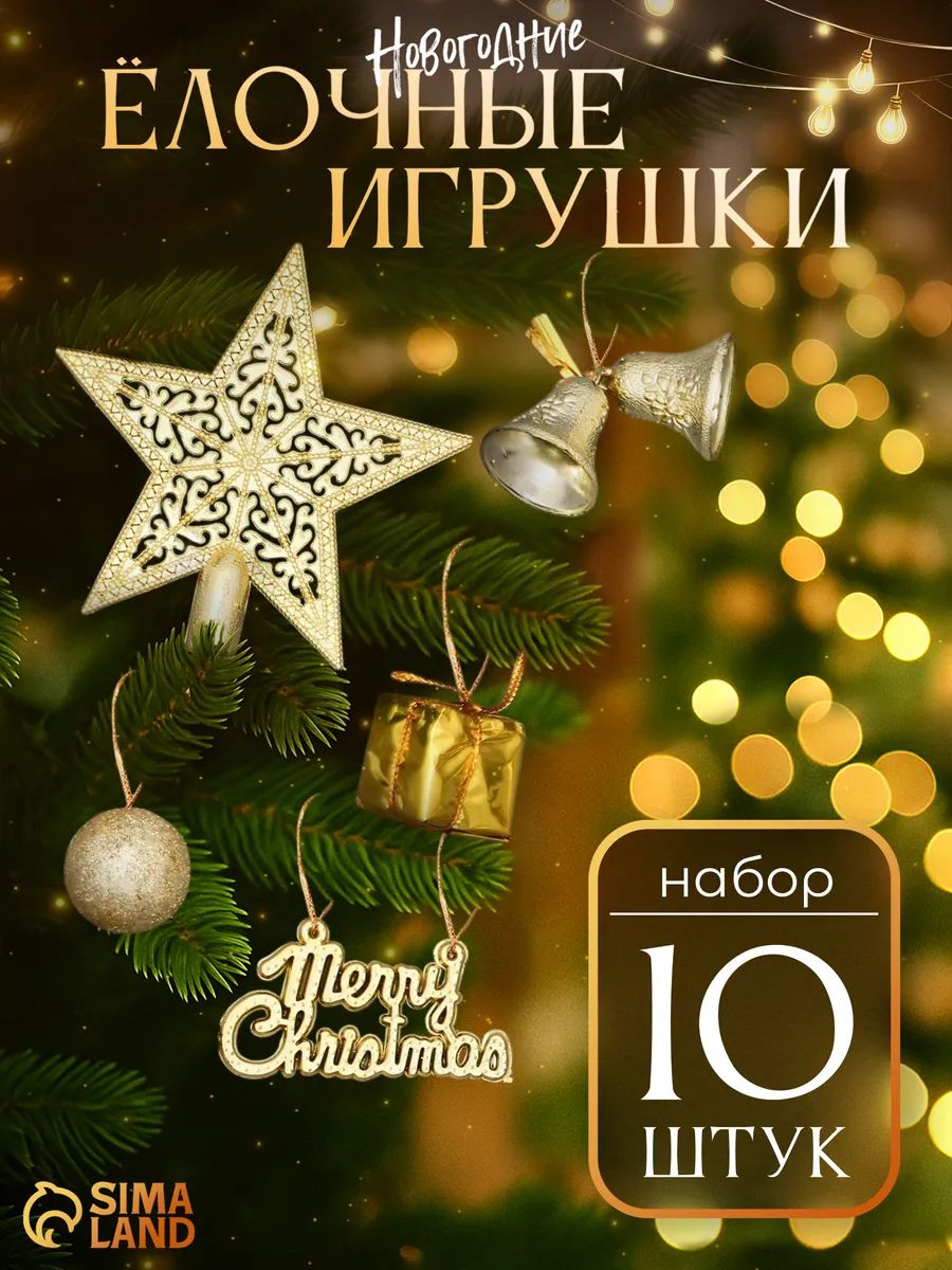 Елочные украшения, набор новогодних игрушек из 10 шт. "Звёздный час" 3х10х15 см, золото