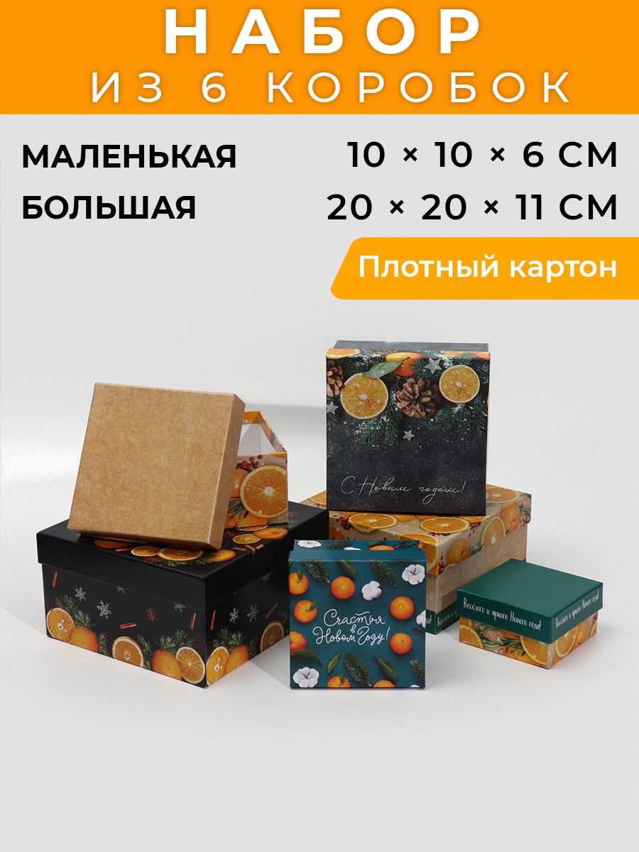 Подарочные коробки новогодние 6 в 1 "Мандариновый", 10 х 10 х 6 - 20 х 20 х 11 см