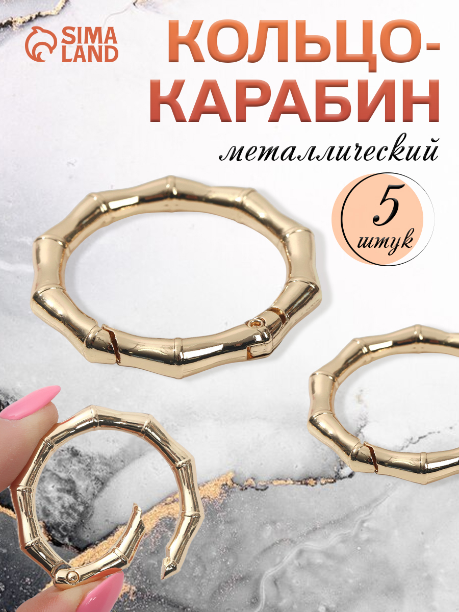 Кольцо-карабин "Бамбук", диаметр 32/44 мм, толщина - 4 мм, 5 шт, цвет золотой
