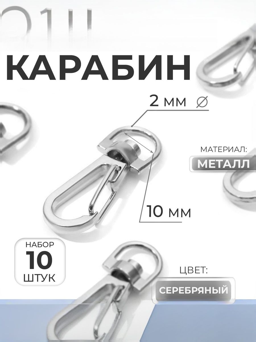 Карабин для сумки металлический, 37 х 13 мм / 10 х 2 мм, 10 шт., цвет серебряный