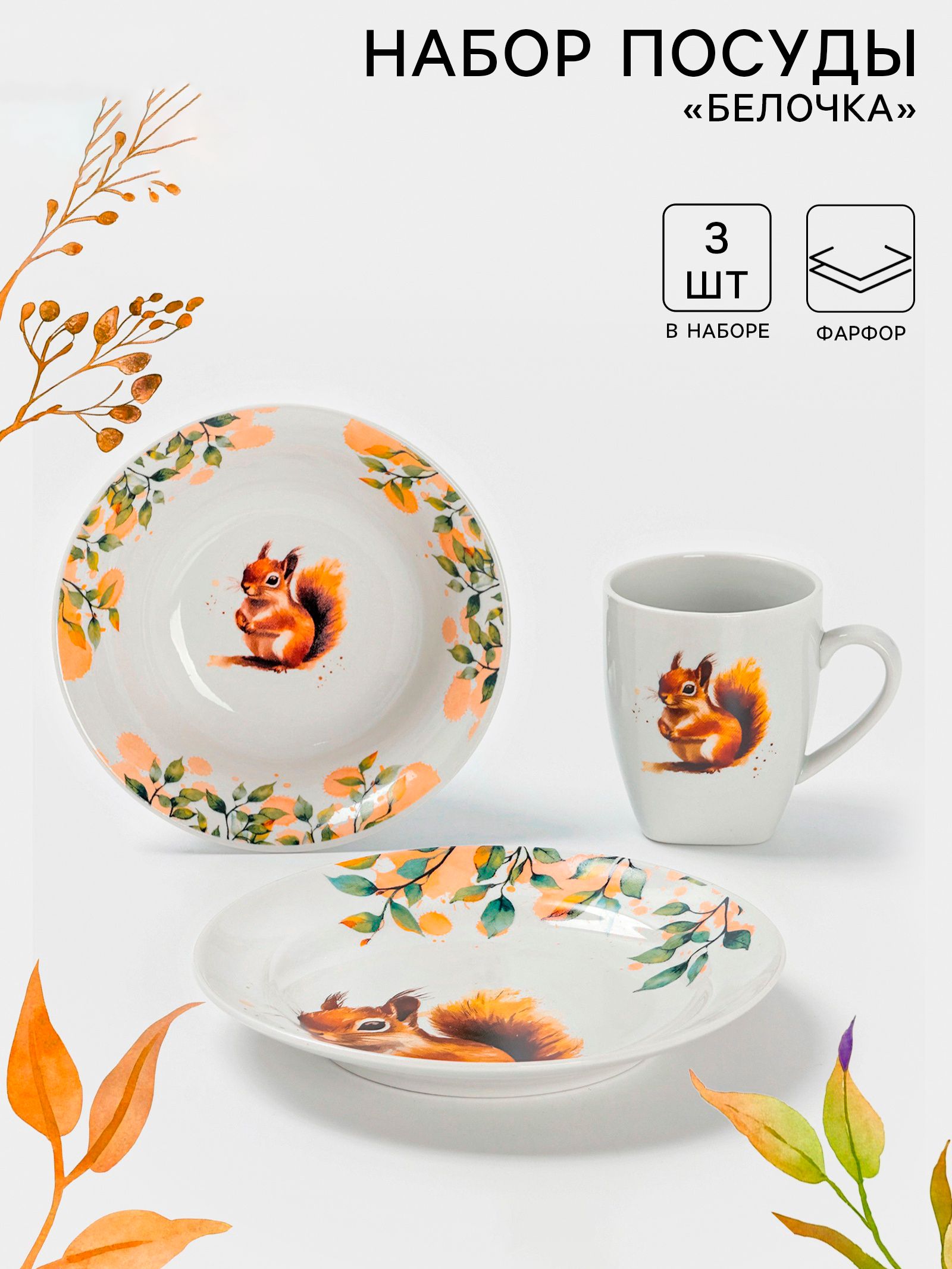 Набор детской посуды 3 предмета: тарелка 17,5 см, миска 360 мл, кружка 210 мл Дулевский фарфор "Белочка"