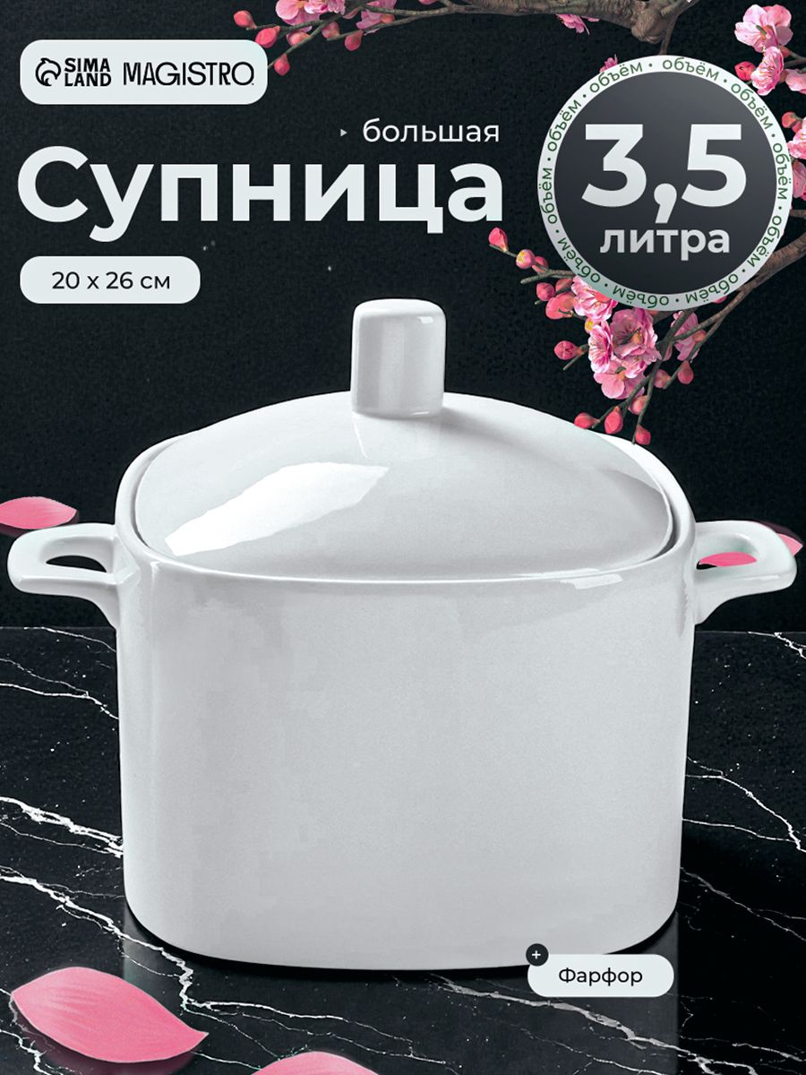 Супница с крышкой и ручками для подачи и сервировки из фарфора Magistro "Бланш", бульонница, цвет белый, 3,5 л