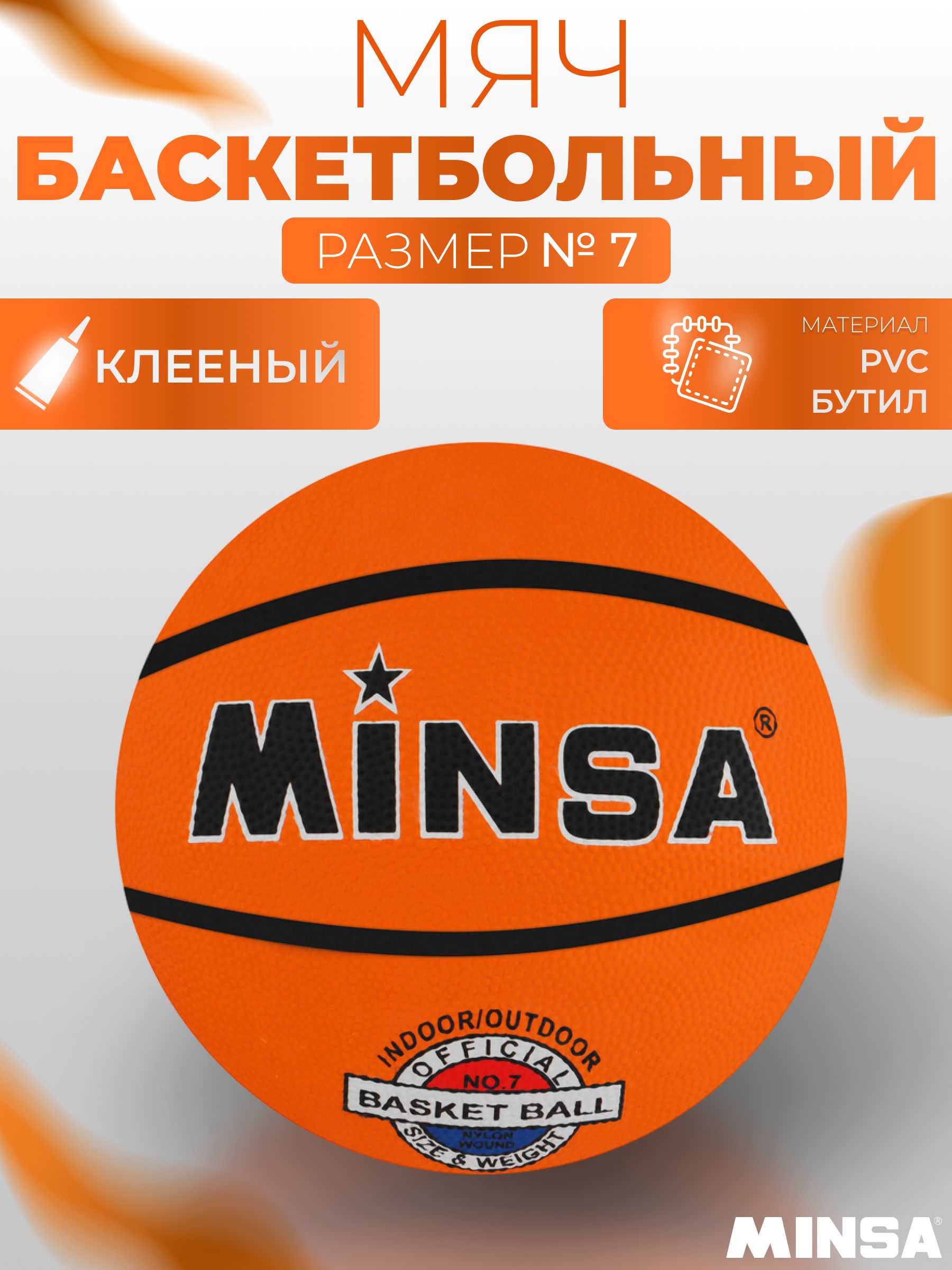 Мяч баскетбольный MINSA, клееный, 8 панелей, р. 7, резина, бутиловая камера