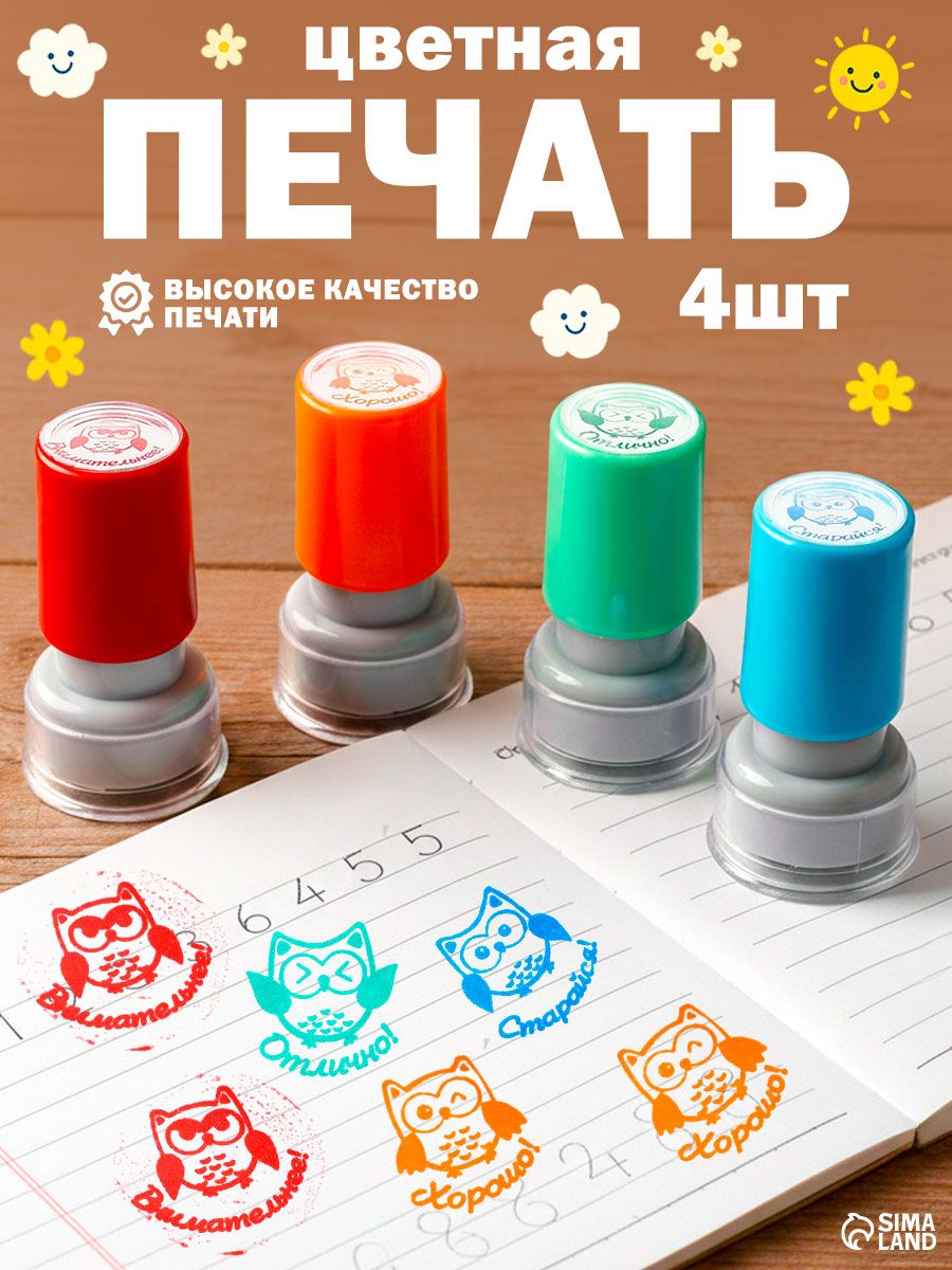 Печать детская оценочная цветная / набор печатей для детей 4 штуки / "Совушка"