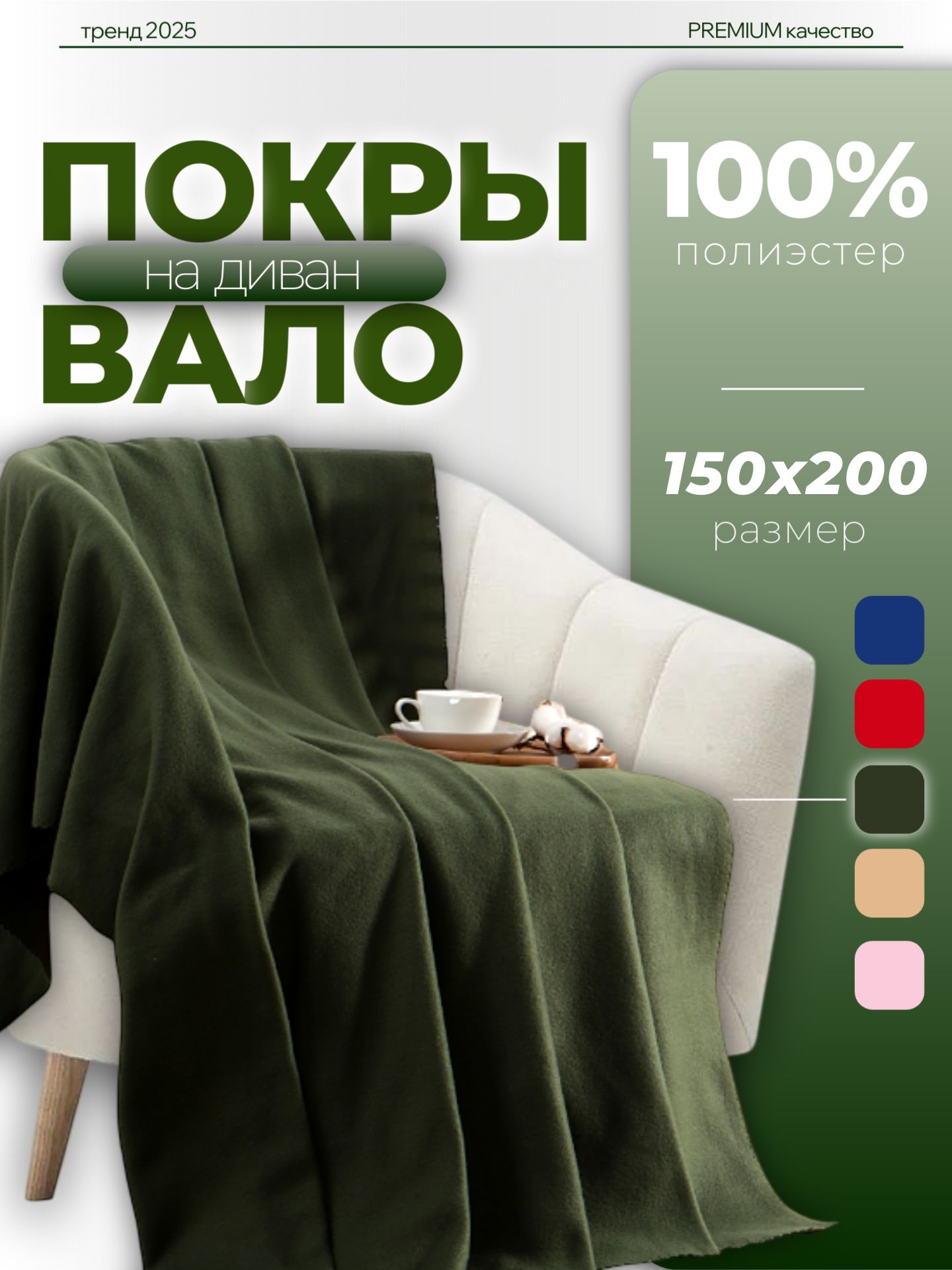 Плед флисовый 150х200 см, покрывало на диван, Темно-зеленый