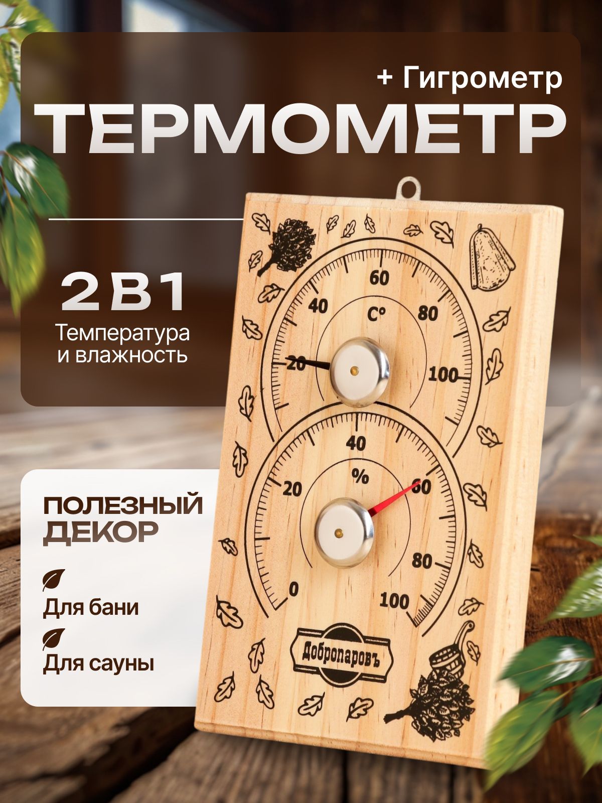 Термометр с гигрометром для бани и сауны Добропаровъ "С легким паром", 20х13 см