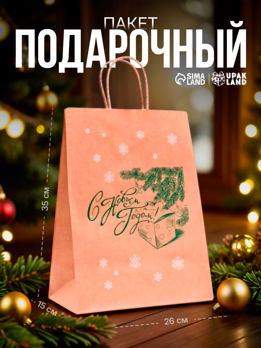 Пакет подарочный, новогодний, 26 х 15 х 35 см, крафт