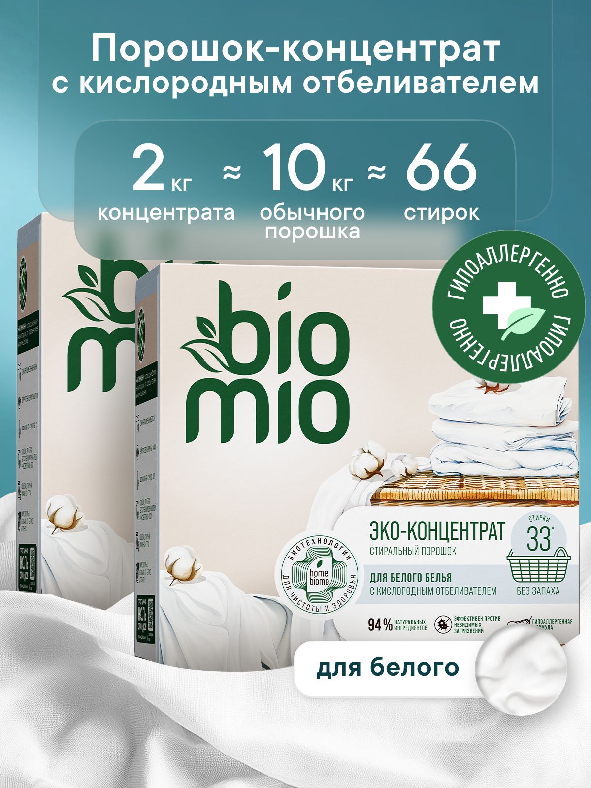 Порошок стиральный автомат BioMio для белого и детского белья от 0. Концентрат. Без запаха. 1000 г (2 шт)